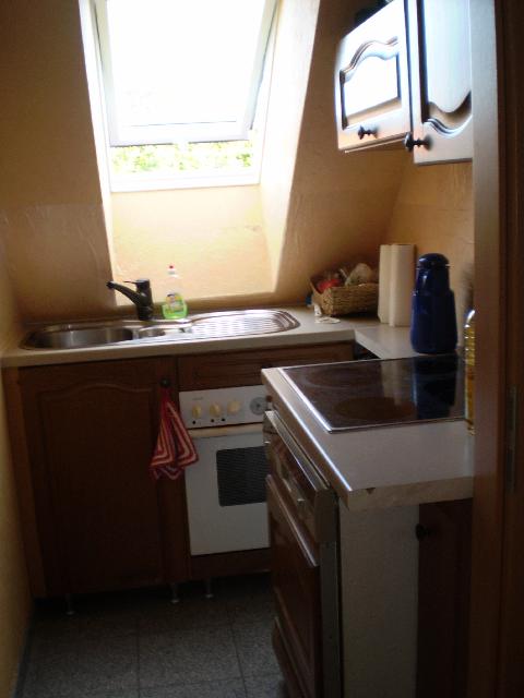 Das Zimmer ist mit Echtholzmöbeln ausgestattet. Der Fußboden in der gesamten Wohnung ist mit Granitfliesen gefliest und hat eine Fußbodenheizung. Die Küche ist klein aber mit allem ausgestattet. Spüle, Glasceranfeld, umschaltbarer Umluftbackofen, Mikrowelle, Spülmaschine, Toaster, Gefrierschrank, Kühlschrank, Kaffeemaschine und Wasserkocher. Es ist alles Geschirr und Kochtöpfe vorhanden. Das Bad ist groß und in ansprechender Ausstattung. Wanne, separater Dusche, Bidet, WC, Waschbecken und Fenster. In der Diele ist u.a. ein Vorratsschrank und ein Klapptische. Von dem Zimmer ist ein Zugang auf den großen Balkon (7,5 m x 4 m, der mit den anderen WGler genutzt wird. In der Waschküche ist die Waschmaschine ein Trockner und Platz zum aufhängen der Wäschestücke zum Trocknen.